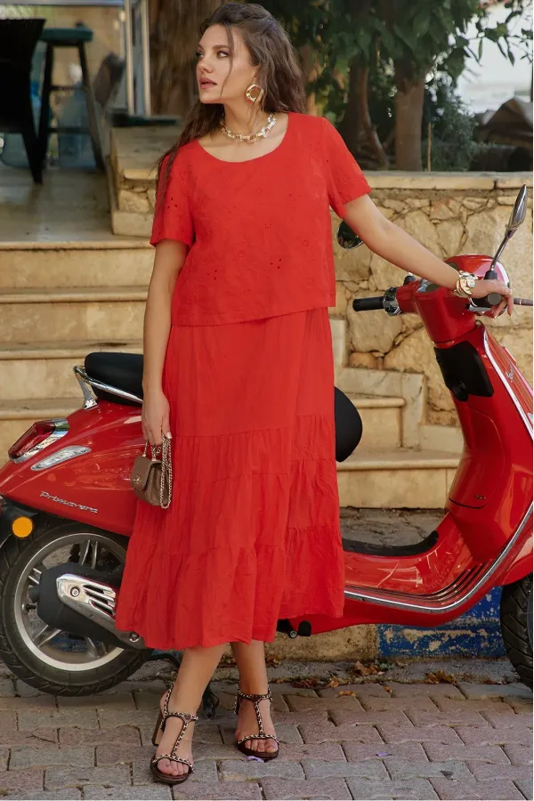 Мы в восторге от данной модели, а Вы? Летнее женское платье в насыщенном алом оттенке из ткани ришелье с тончайшей вышивкой ришелье, и однотонного материала представляет собой настоящее произведение искусства, воплощающе... Читать далее...