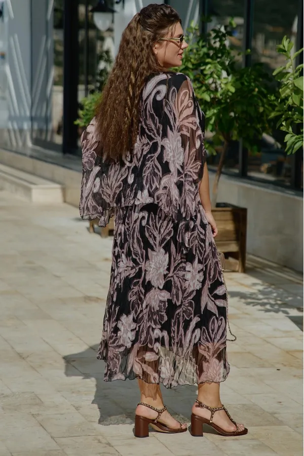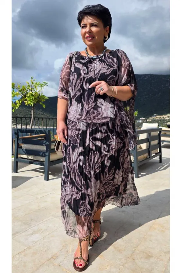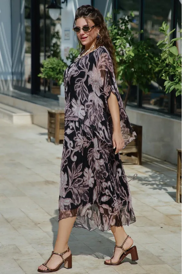 Платье, которое вскружит голову! Оно восхитительно смотрится на фигуре, подчеркивая ваши формы и скрывая недостатки. Представляем вашему вниманию эффектное платье, которое воплощает в себе изысканность и непринужденность. Изготовленное из легкой, полупрозрачной ткани с многослойной структурой, оно создает воздушный и динамичный образ. Узор из стилизованных листьев и абстрактных элементов в приглушенных тонах черного, серого и лилового придает платью особую глубину и выразительность. Свободный крой с короткими рукавами обеспечивает максимальный комфорт и позволяет платью струиться по фигуре, деликатно подчеркивая ее достоинства. Асимметричный низ добавляет современности и легкости, создавая игривый силуэт. Это платье идеально подходит для создания как элегантных дневных, так и вечерних образов, легко сочетаясь с различными аксессуарами. Оно станет незаменимым элементом гардероба для тех, кто ценит комфорт, индивидуальность и утонченный стиль. Верхняя часть платья отлетная на подкладке с цельнокроенным рукавом .Нижняя часть платья с расклешением, низ ассиметричный так же на подкладке. Длина платья от высшей точки плечевого шва до низа 132 см. Длина рукава 24 см (р 52-56), 25,5 см (р 58-62).Подробные замеры смотрите на дополнительном фото. Подходит на рост 164-170.