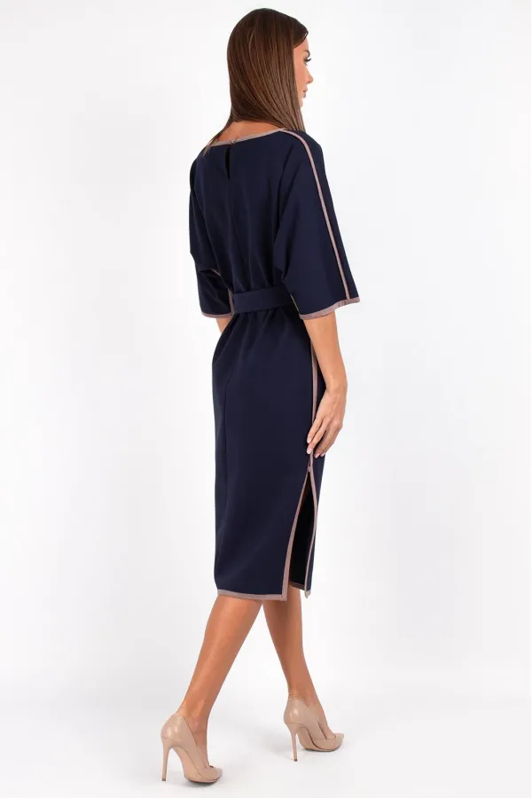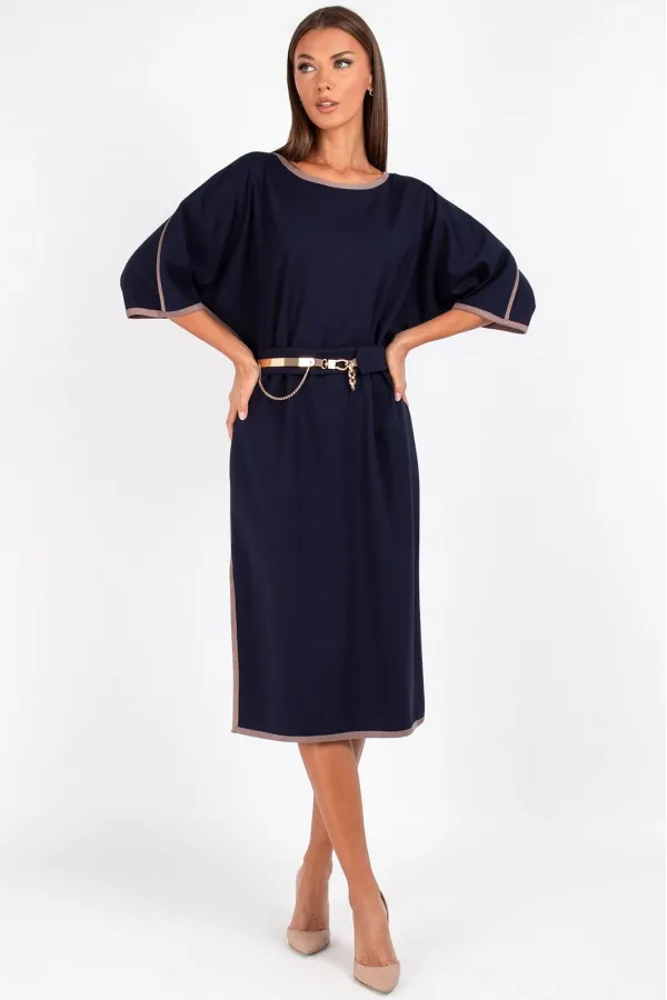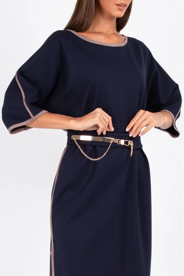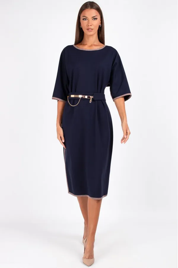 Съёмный пояс с металлическими элементами цвета золота подчёркивает талию и завершает композицию, превращая платье в универсальный вариант для офиса, прогулок или вечерних мероприятий.