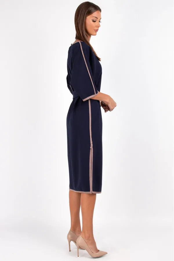 Контрастная отделка по горловине, рукавам, плечевым и боковым швам придаёт модели выразительность, а декоративная пуговица на боковом разрезе добавляет изящный акцент.