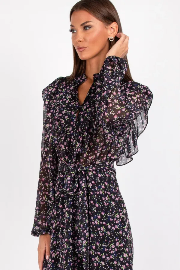 Платье женское полуприлегающего силуэта, отрезное по линии талии на резинке. Передняя часть платья с нагрудными вытачками, швом посередине, с кокеткой и вставленной в нее рюшей. Перед с застежкой на 3 навесные петли и пу... Читать далее...