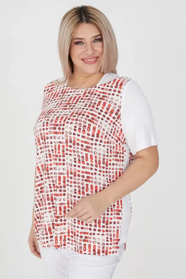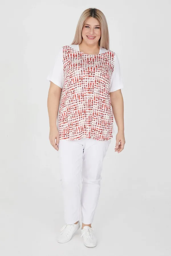 Повседневная женская футболка от компании LUXURY PLUS. Стильная комбинированная футболка полуприлегающего силуэта. Основа выполнена из вискозного трикотажа в яркий принт. Прилегание по груди за счет вытачек. Вырез горлов... Читать далее...