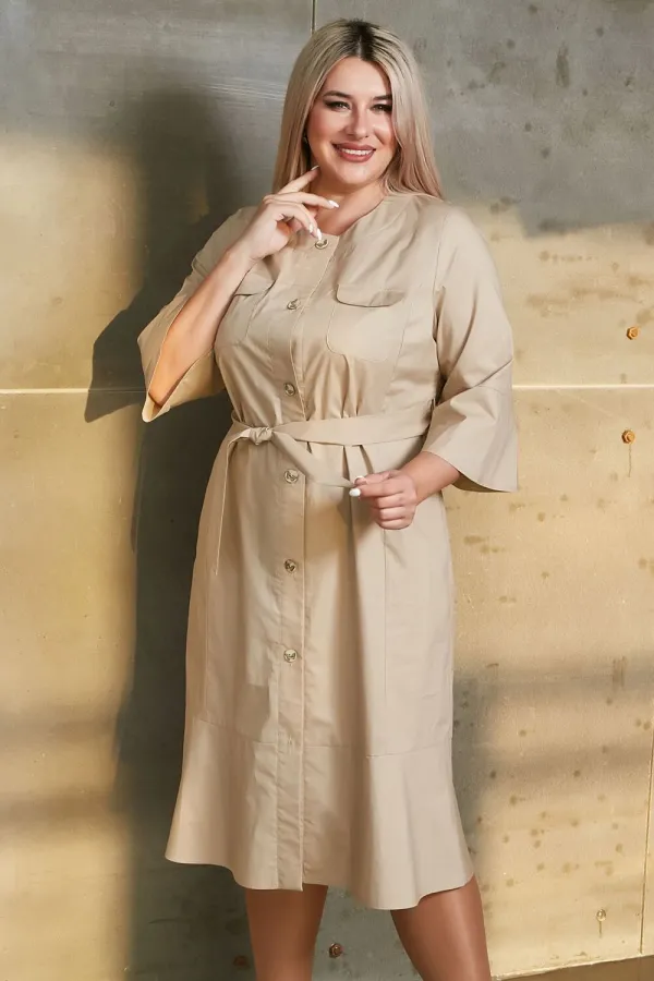 Превосходное женское платье от бренда Luxury plus. Модель прилегающего силуэта, выполнена из хлопковой ткани в бежевом цвете. Комфортное прилегание по фигуре - за счёт вертикальных рельефов переда и спинки. Вырез горловины круглый, по борту притачная планка с застёжкой на петли и пуговицы. В боковых швах удобные карманы. На уровне груди накладные карманы с клапаном. Втачные рукава длиной 3/4. Перед, спинка и рукава по низу дополнены воланом. Низ ровный. Модель комплектуется поясом. Отличной подойдет для повседневной носки.