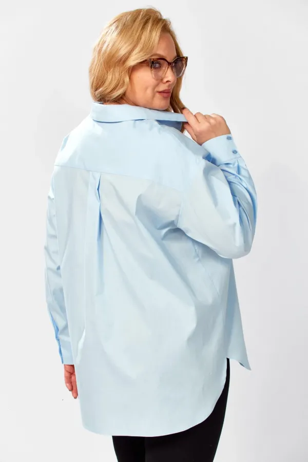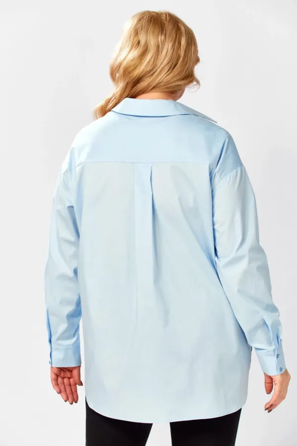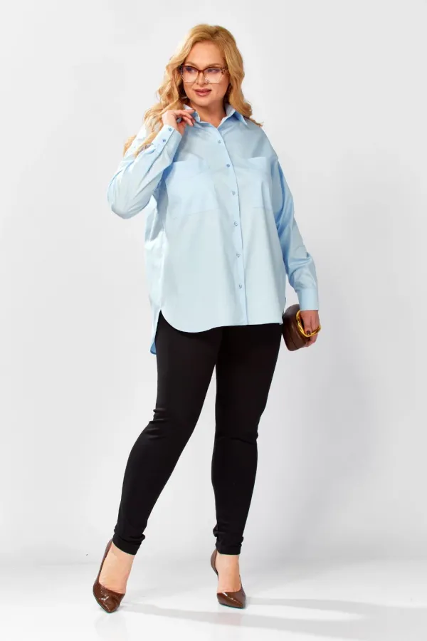 Рубашка свободного силуэта. Рукав рубашечный с разрезом и складками,заканчивается манжетой, которая застегивается на 2 петли и пуговицы.Плечо спущенное. На спинке двойная кокетка, от кокетки по центру спинки идет встречная складка. На переде вверху 2 симметричных накладных кармана. Длина по спинке(от точки основания шеи) -80см, длина по переду(от точки основания шеи)-75,5см, длина рукава+манжета-54,5см, длина плеча-21см. Ткань поплин, тянется по ширине. Параметры модели: обхват груди-108, обхват бедер-114, размер изделия на модели 56