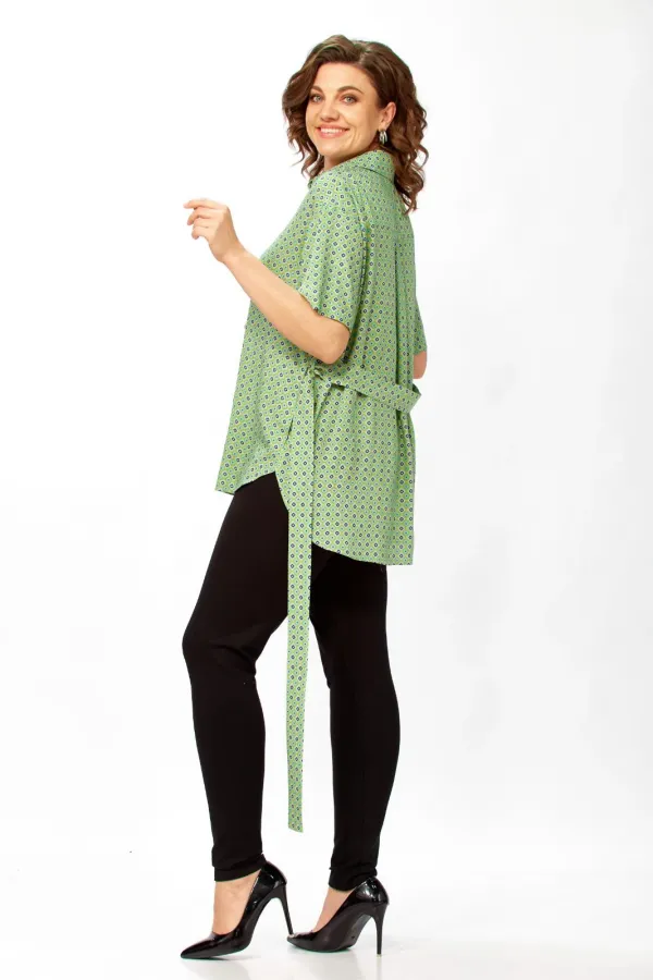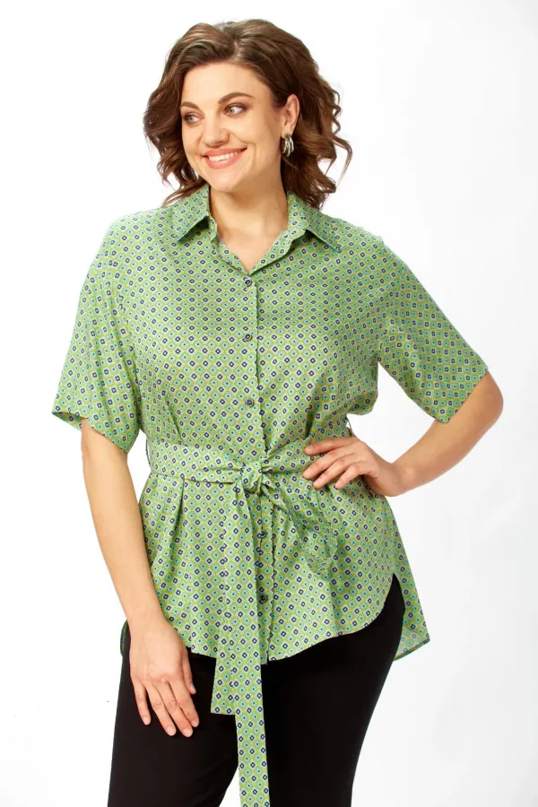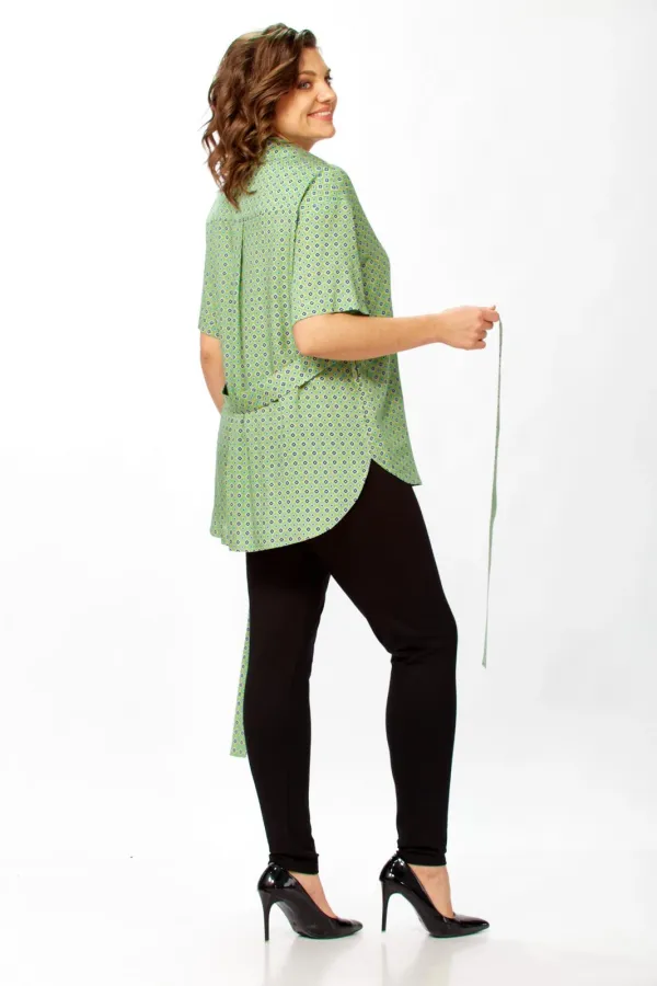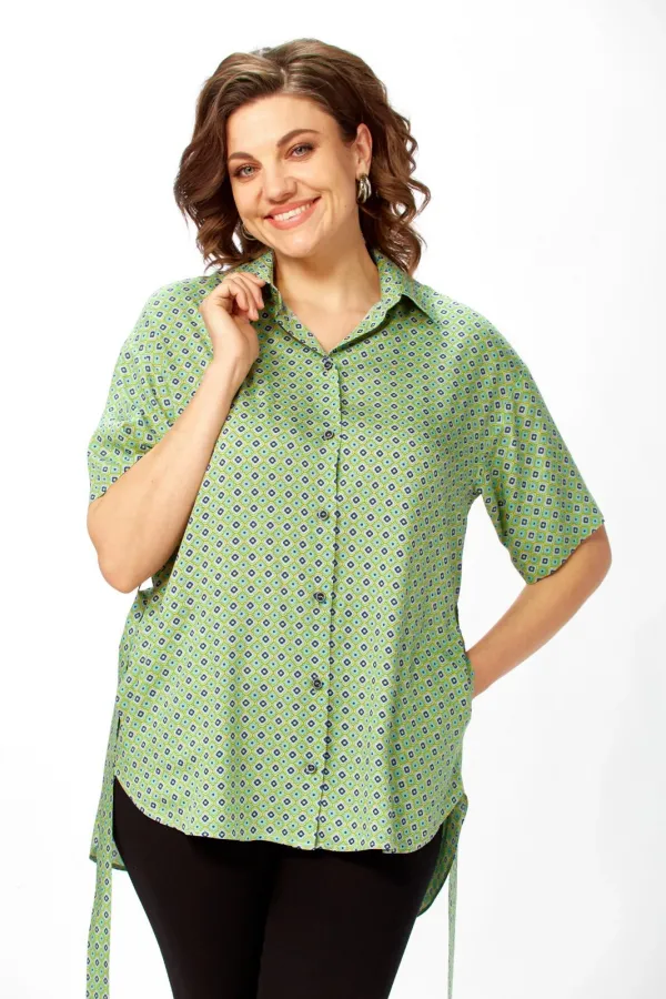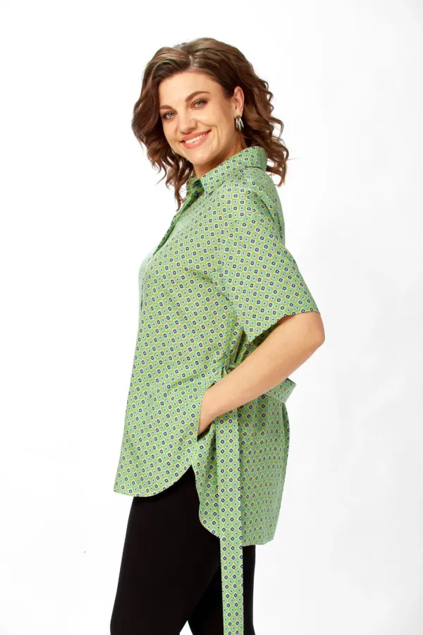 Рубашка свободного кроя.Низ переда и спинки закругленные, спинка чуть длиннее переда. Рубашка застегивается на петли-пуговицы. В боковых швах карманы. Рукав рубашечный короткий. Длина по спинке(от точки основания шеи) -79см, длина рукава-21см, длина плеча-20,5см. Параметры модели: обхват груди-98см, обхват бедер-110см, размер топа на модели 50. модели: обхват груди-98см, обхват бедер-110см, размер топа на модели 50.