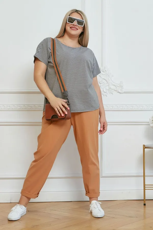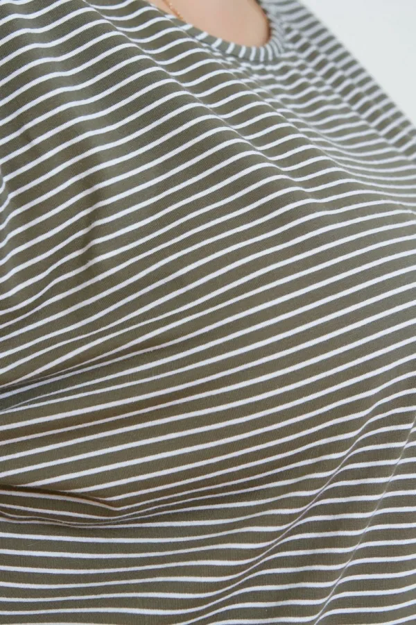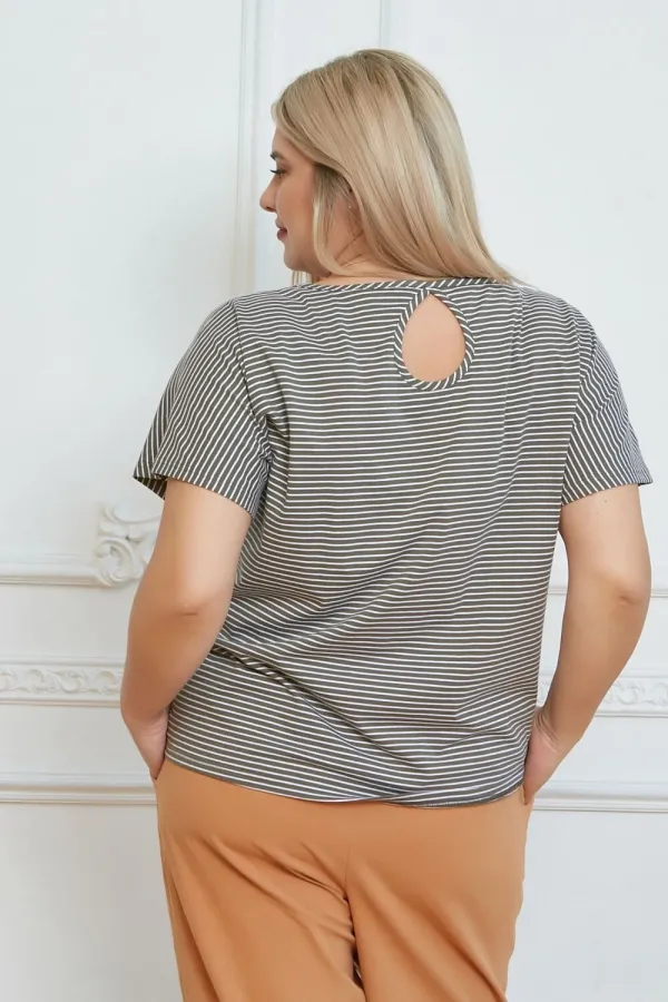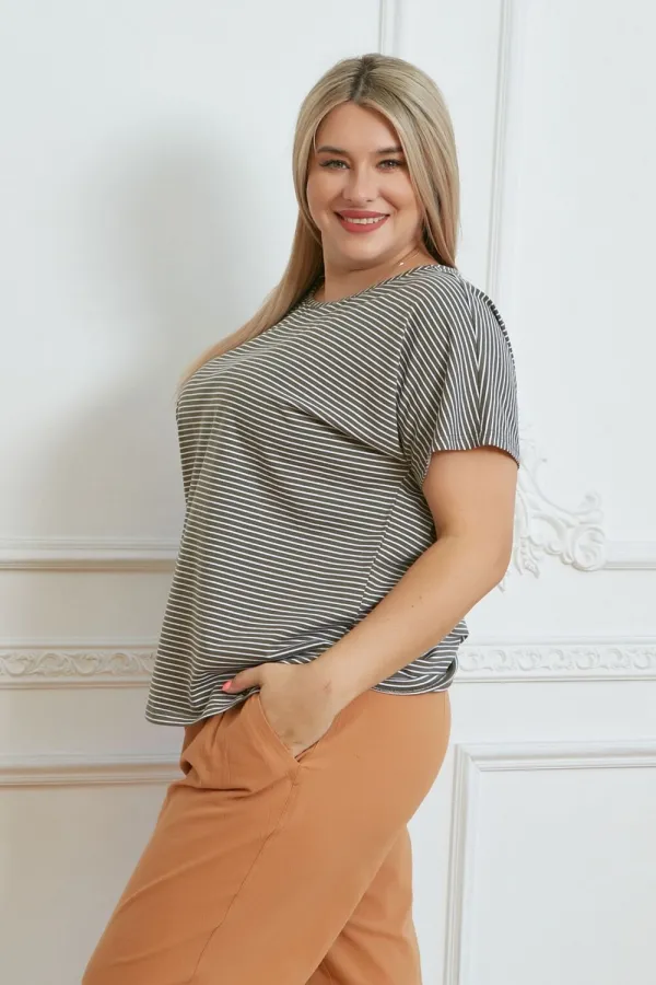 Стильная женская футболка от компании Luxury plus. Модель свободного силуэта, выполнена из эластичного вискозного трикотажа цвета хаки с принтом полоска. Рукав цельнокроеный укороченный. Круглый вырез горловины и вырез "капля" по спинке обработаны окантовкой. Низ изделия ровный. Модель отлично дополнит комплект юбкам и брюкам.