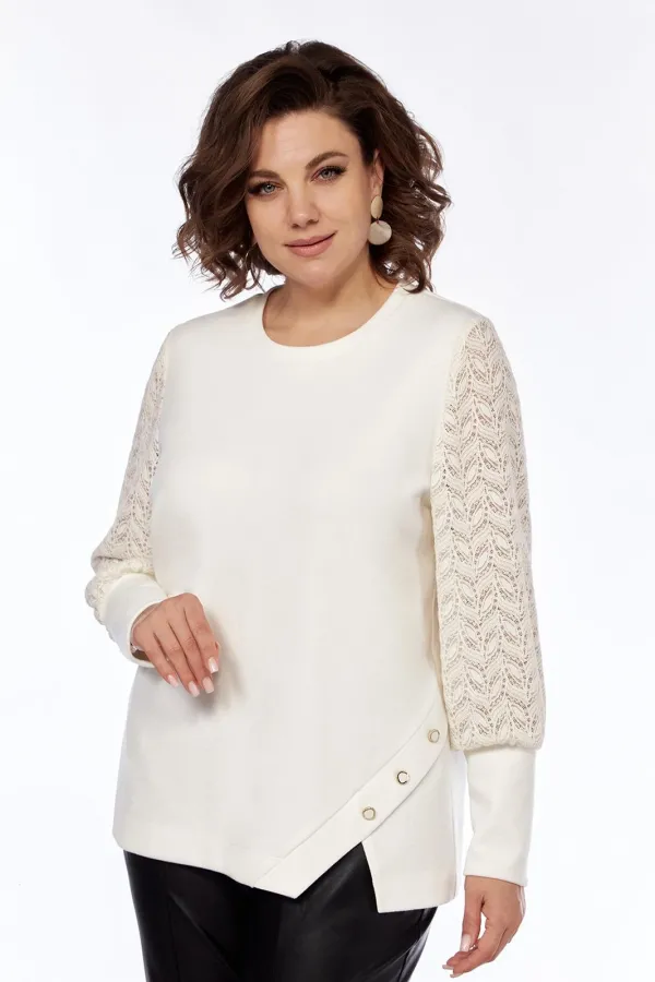 Джемпер женский нарядный, прямого силуэта, выполнен из трикотажного полотна. Горловина округлой формы. Низ переда с асимметричным элементом, декорированный пуговицами. Спинка цельнокроенная. Рукава втачные на манжете выполнены из ажурного трикотажного полотна.