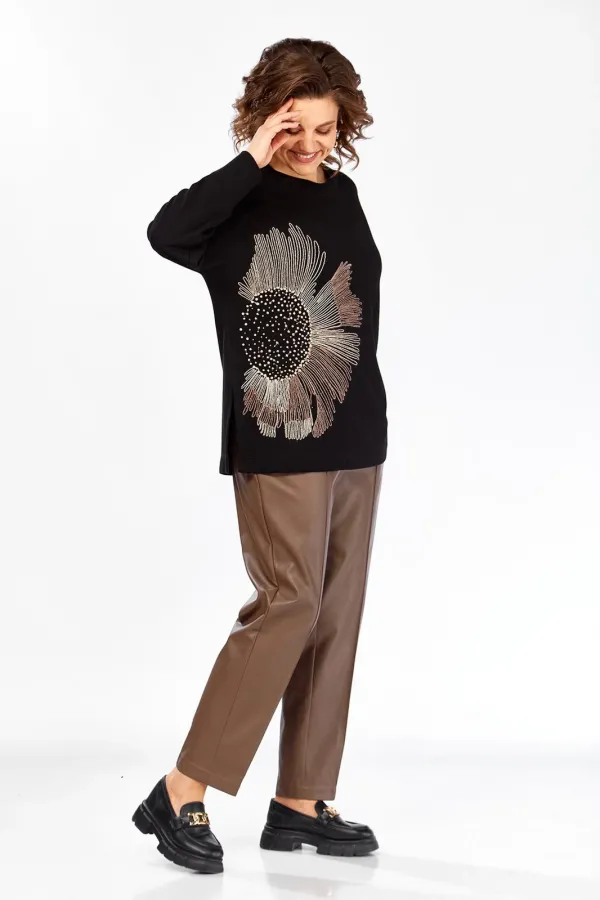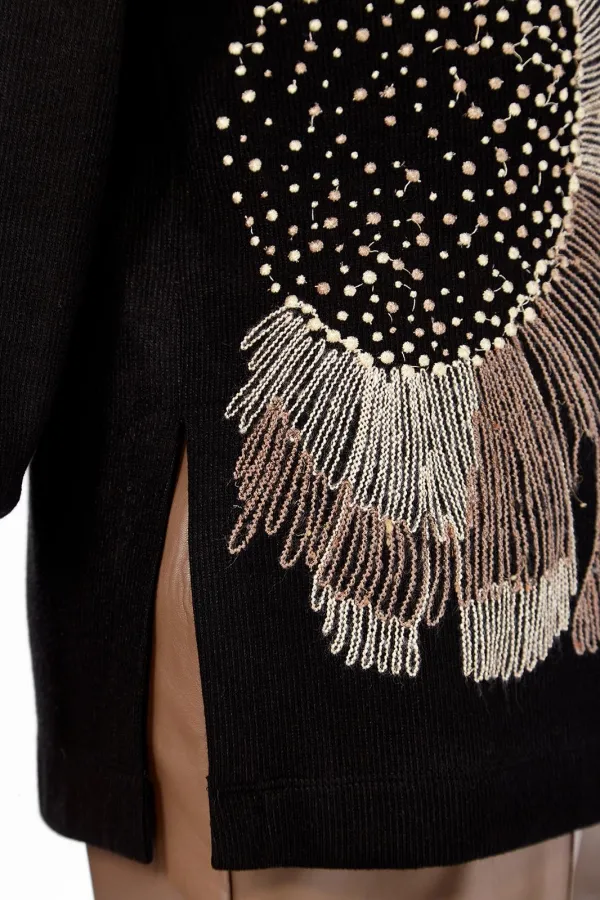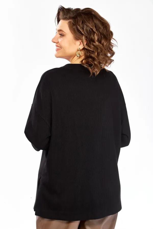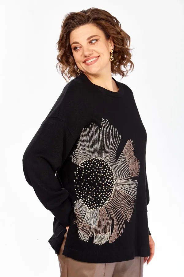 Джемпер женский, свободного кроя, изготовлен из трикотажного полотна. Горловина круглой формы. На полочке — вышивка. Спинка цельнокроенная. Рукава спущеные, с манжетам по низу. В боковых швах разрезы. Длина джемпера по спинке — 69 см, длина плеча + рукав — 73 см.