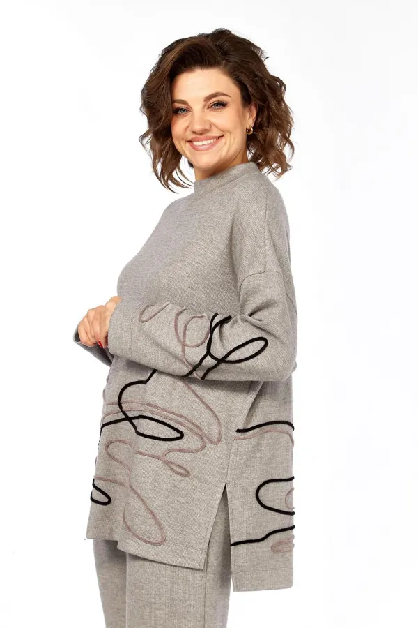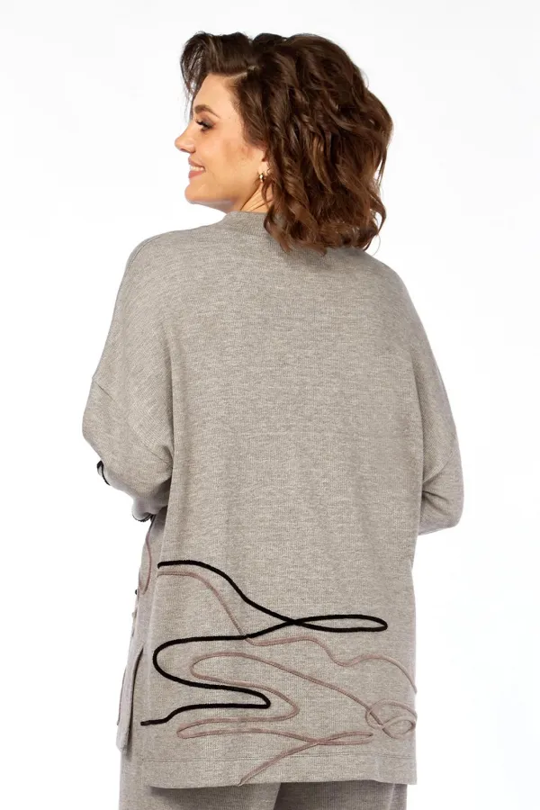 Джемпер женский, свободного кроя, изготовлен из трикотажного полотна. Горловина обработана воротником — стойкой по переду спинке и рукаву вышивка шнуром. В боковых швах внизу — разрезы. Рукава спущенные длинные.