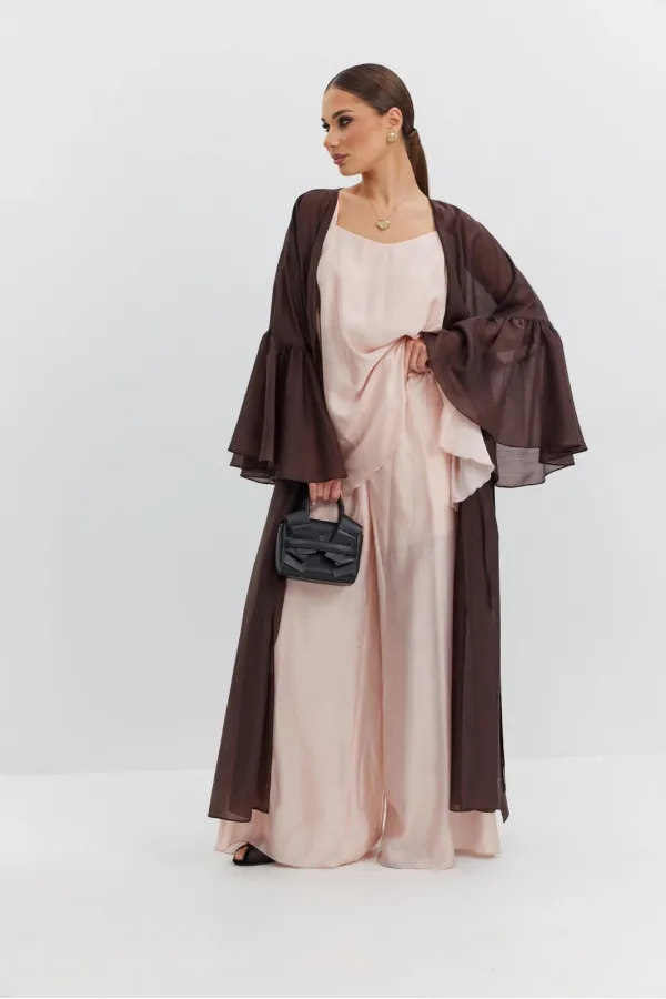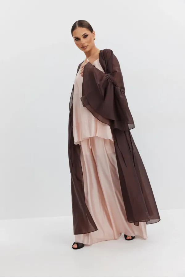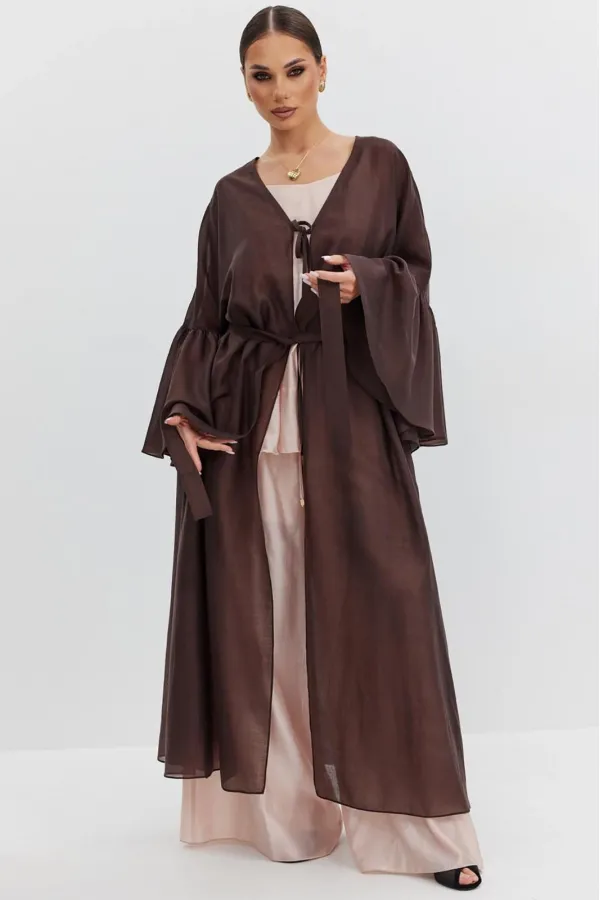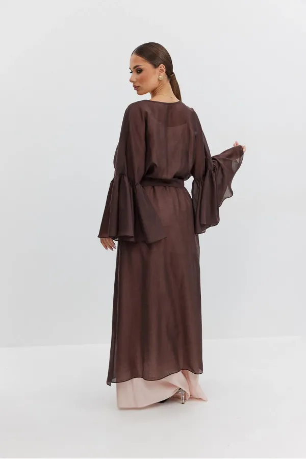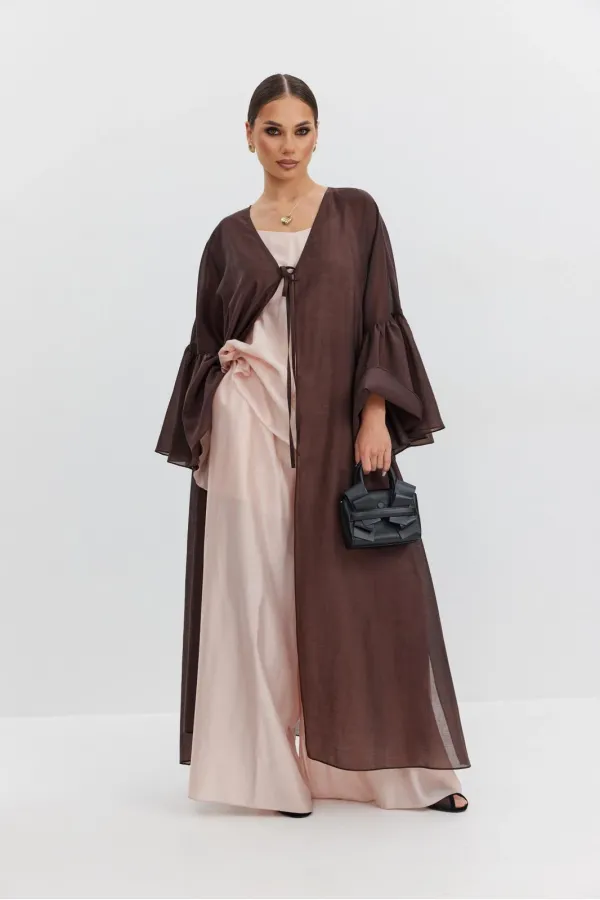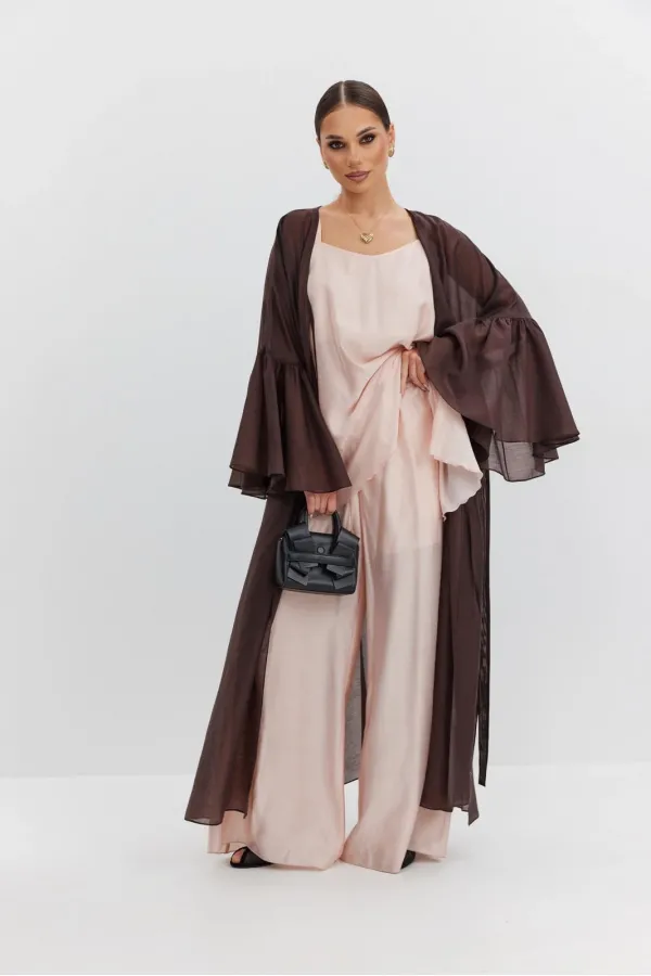 Туника женская объёмного силуэта, длиной миди, без застежки. Вырез горловины плавной формы, обработан окантовками, переходящими в завязки по переду. Рукав спущенный, с широким собранным воланом по низу. По боковым швам выполнены высокие разрезы.