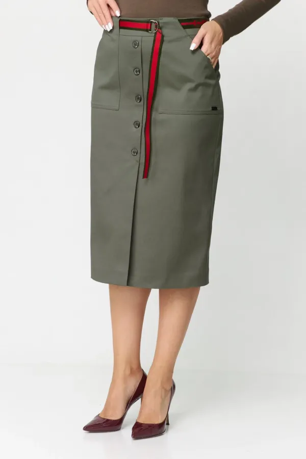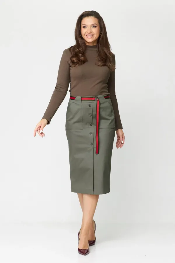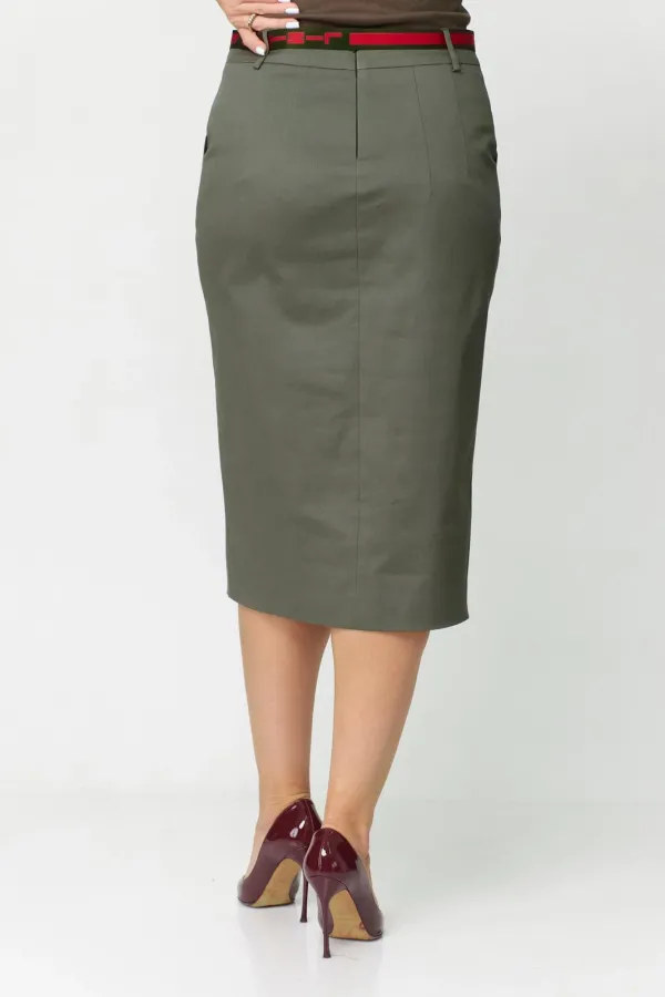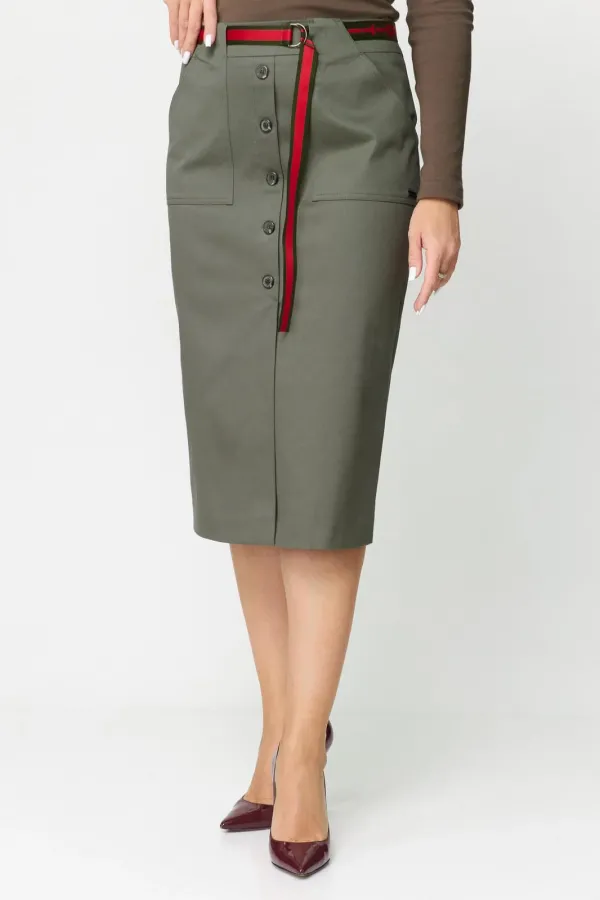 Юбка женская из хлопковой ткани. На подкладке, прямого силуэта, заужена к низу. Притачной пояс-кокетка, настрочены по переду накладные карманы и обработана по центру планка, которая заканчивается шлицей. Спинка со средним швом и талиевыми вытачками. В среднем шве застежка на потайную тесьму-молнию. К юбке прилагается пояс. Длина юбки по боковому шву 68 см.