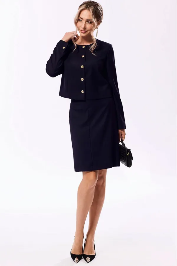 Юбка с пришивным поясом, застежкой на потайную молнию в среднем шве заднего полотнища. Заднее полотнище с талиевыми вытачками. Заднее полотнище со средним швом, заканчивающимся разрезом.