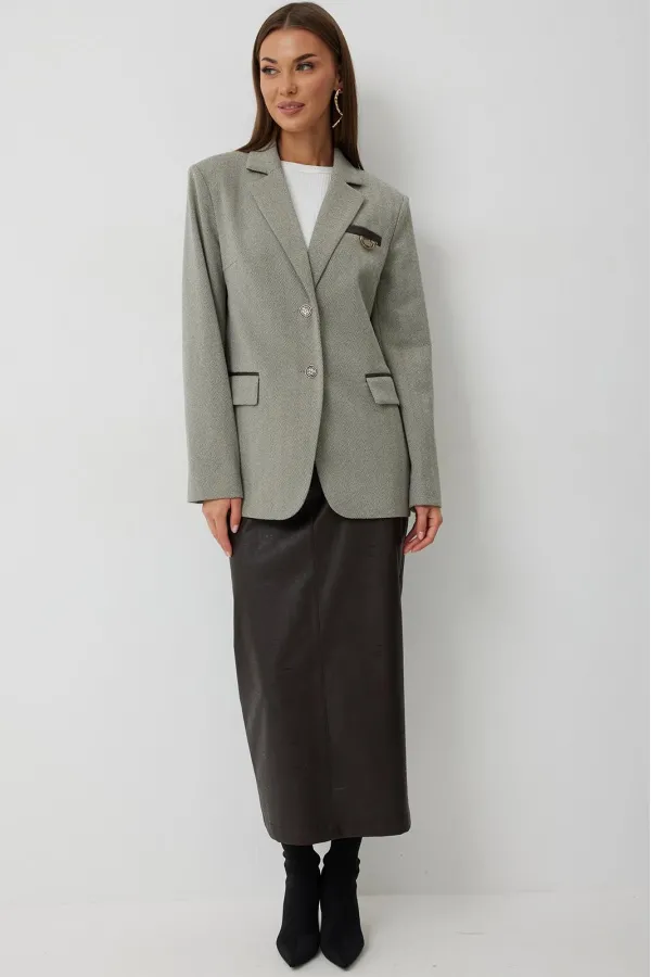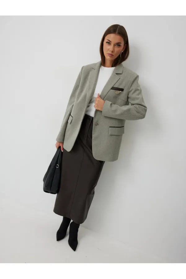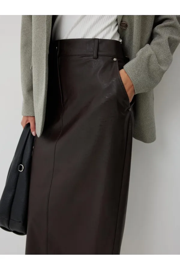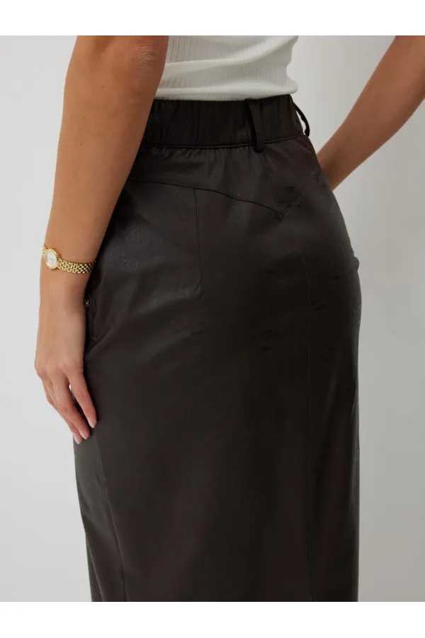 Юбка-карандаш женская из искусственной кожи. Длина юбки до середины икры. По переду в юбке обработаны карманы с отрезным бочком, по концам кармана установлены хольнитены. Перед юбки с центральным швом, в котором обработа... Читать далее...