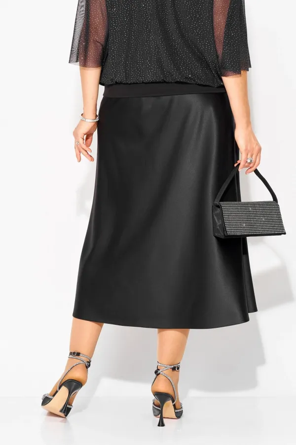 Юбка длиной миди, выполнена из атласного сатина, на трикотажной подкладке. Модель за счет выверенного кроя по-косой смотрится роскошно и элегантно. Пояс на круговой резинке обеспечивает 100% посадку по фигуре.