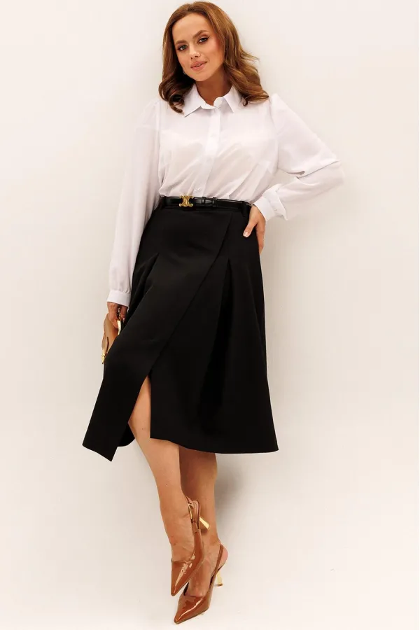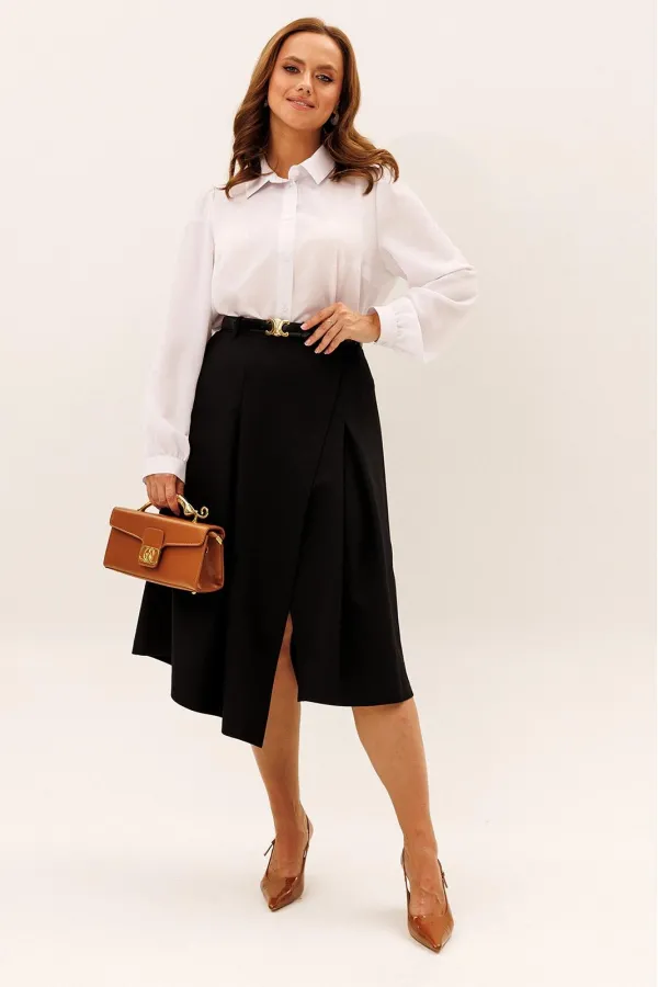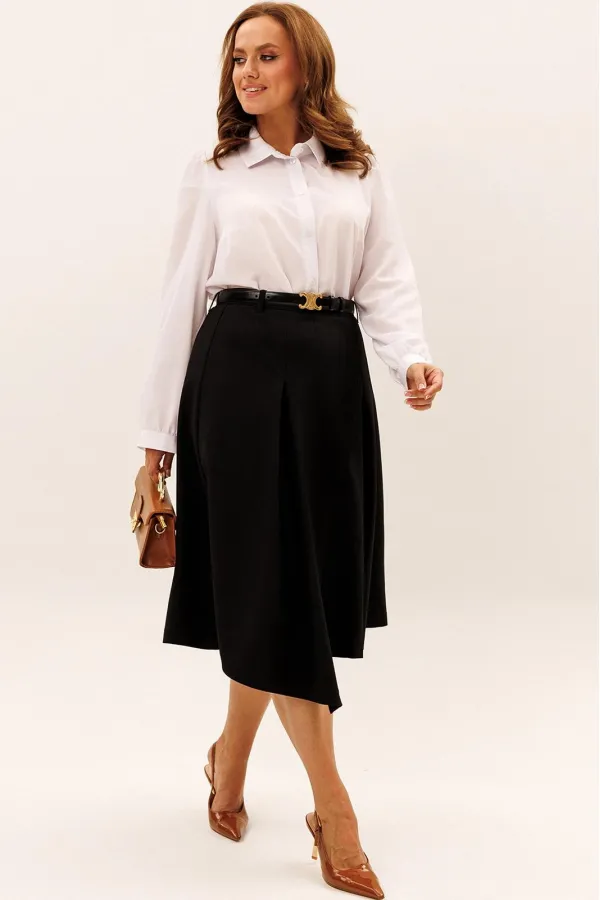 Юбка А-силуэта. По переду и по задней половинке встречные складки. Перед юбки ассиметричный. В боковой шов вставлена потайная молния. Верх юбки обработан притачным поясом со шлёвками, который застёгивается на петлю и пуг... Читать далее...