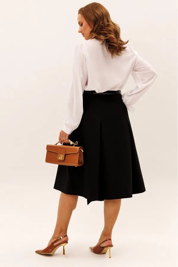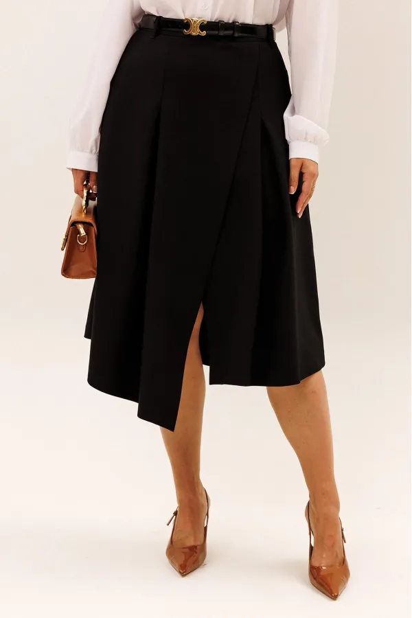 Юбка А-силуэта. По переду и по задней половинке встречные складки. Перед