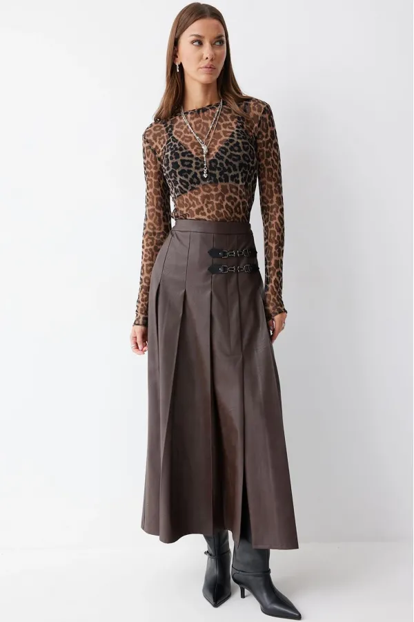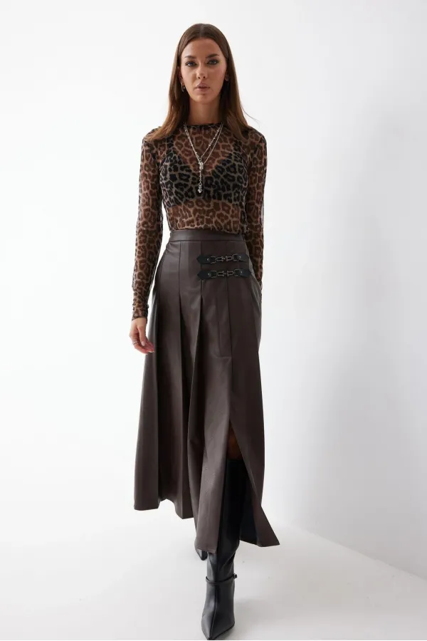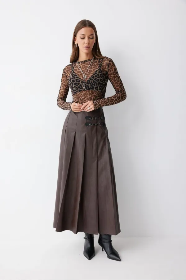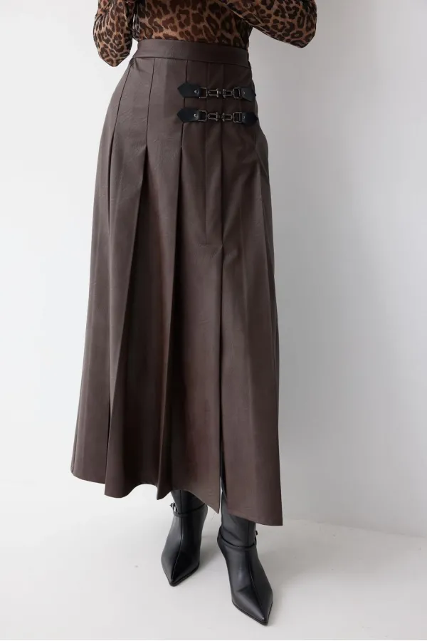 Юбка А-силуэта из экокожи на хлопковой основе длины макси. По верху юбки притачной пояс со шлевками для ремня. Переднее полотнище юбки со складками и шлицей и декоративной фурнитурой. На задних половинках расположены талиевые вытачки. На спинке в центральном шве потайная молния. По бокам в поясе вставлена резинка от складки до вытачки.