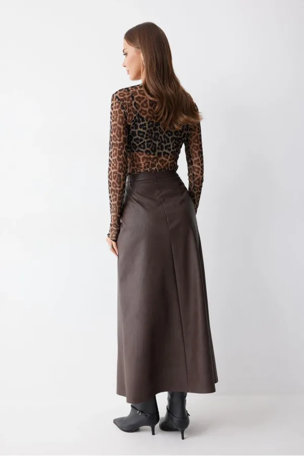 Юбка А-силуэта из экокожи на хлопковой основе длины макси. По верху юбки притачной пояс со шлевками для ремня. Переднее полотнище юбки со складками и шлицей и декоративной фурнитурой. На задних половинках расположе... Читать далее...