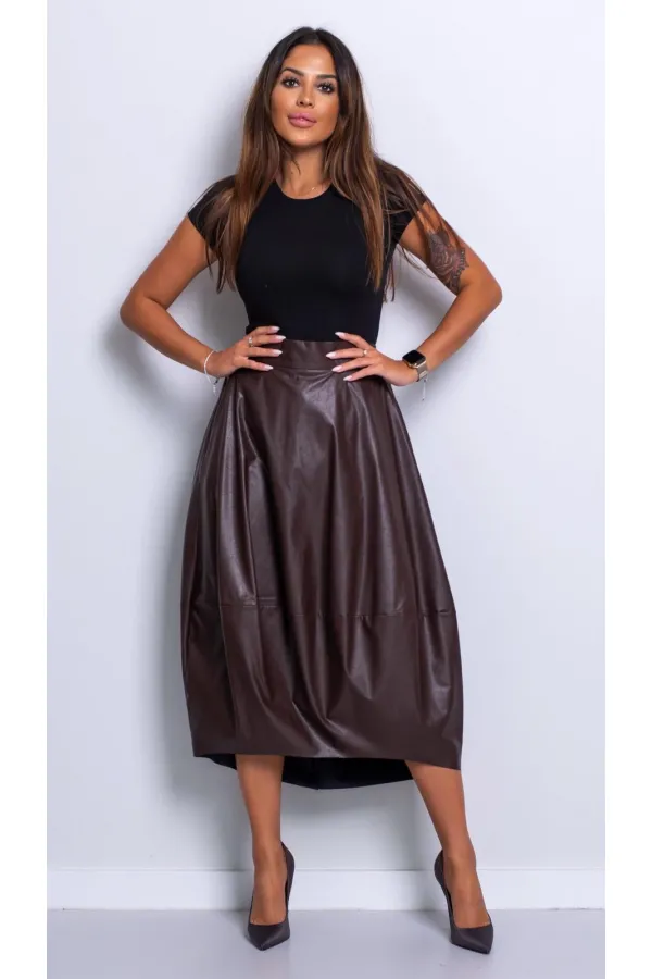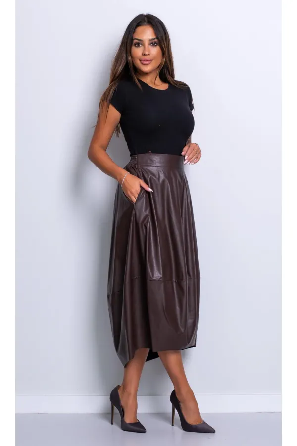 Модная юбка стиля бохо из эко-кожи - это всегда про удобство, стиль и комфорт. Особенности модели: притачной пояс, в боковых швах обработаны карманы. Длина юбки сзади больше, чем спереди - ассиметричный низ. Юбка колокольчик миди женская сочетается с любым верхом, подчеркивается поясом. Благодаря своему длинному крою она придает женственности и изысканности вашему образу. Плотная ткань, из которой сделана эта юбка, прекрасно подходит для переменчивой погоды.