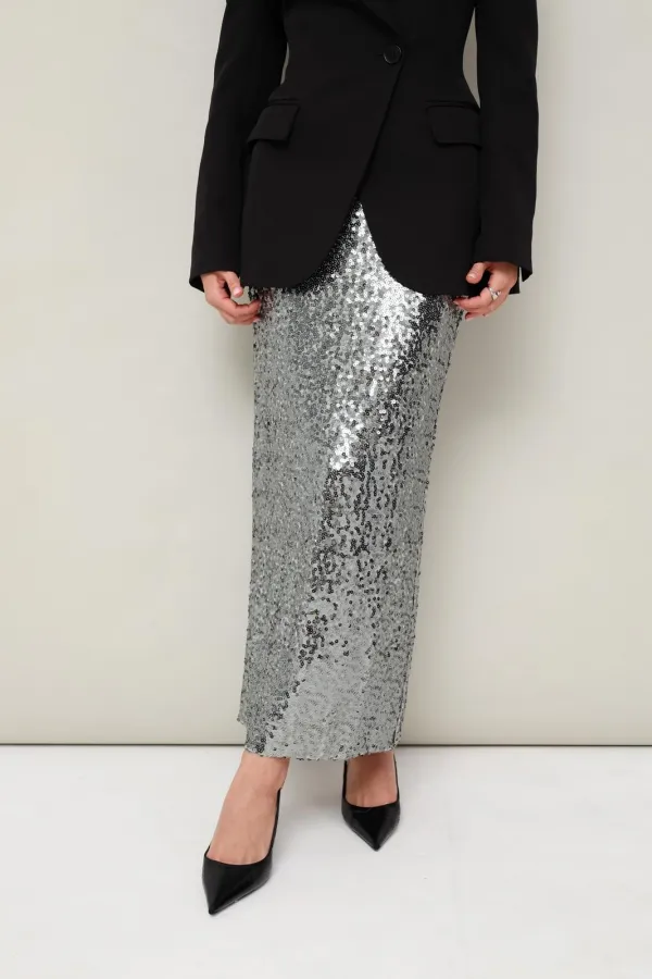 Юбка, декорирванная пайетками, на подкладке. Пояс на резинке,хорошо тянется. Юбка прямого полуприлегающего силуэта.