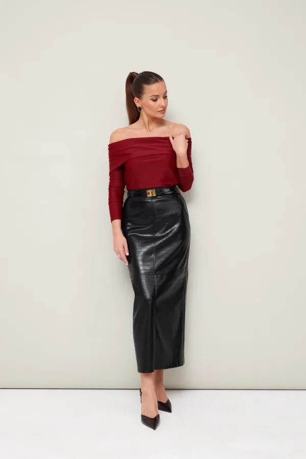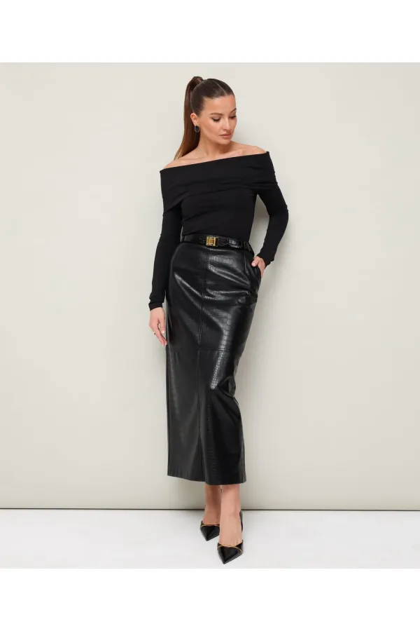 Юбка на подкладке в длине миди с боковыми наклонными карманами. Притачной пояс с застежкой в среднем шве на потайную молнию. Для удобства движения сзади обработана шлица. *Ремень представлен как вариант стилизации образа.