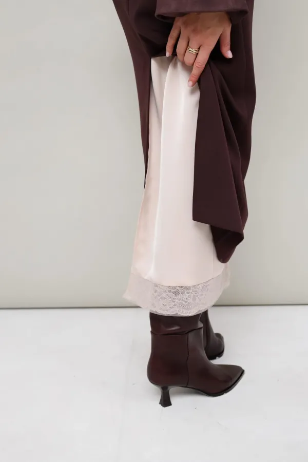 Юбка-карандаш прямого силуэта в длине миди. Верхняя юбка выполнена из костюмно-плательной ткани, пояс на обтачке, застёжка на потайную молнию в среднем шве по спинке. Нижняя юбка на резинке по поясу, низ обработан кружев... Читать далее...