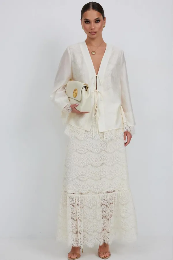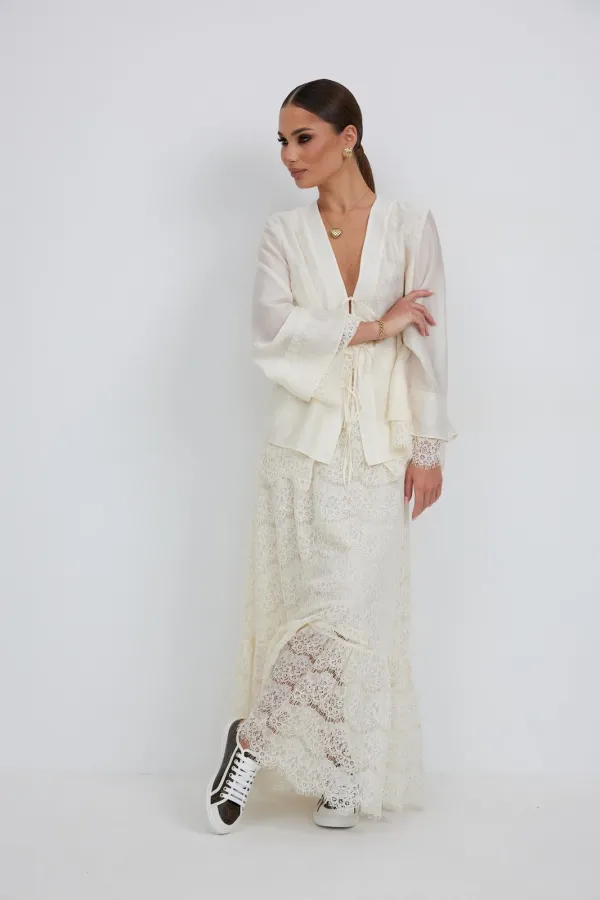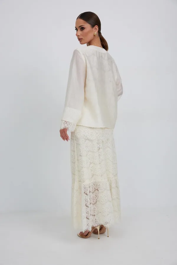 Юбка женская из кружевной ткани, имеет А-образный расширенный силуэт, с широким воланом со сборкой по низу, длина макси, юбка на подкладке. Верх юбки на поясе, со шлевками под ремень, застежка на потайную молнию по среднему шву сзади.