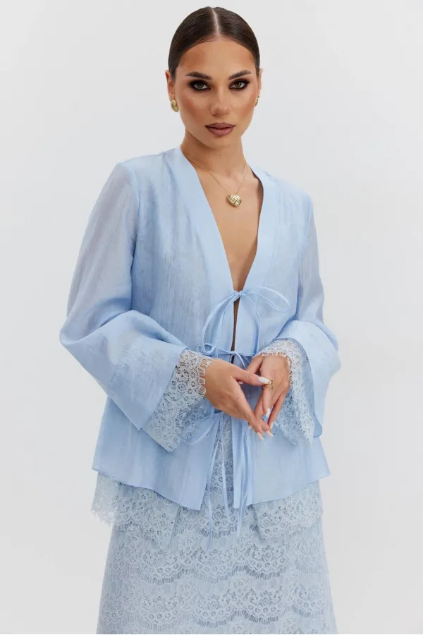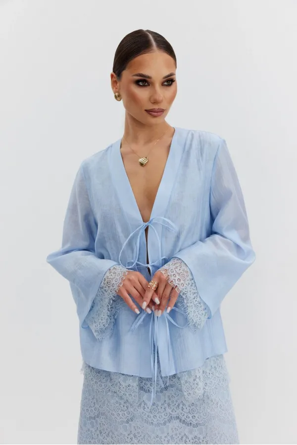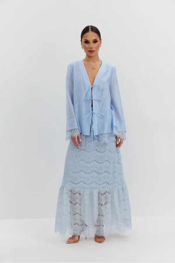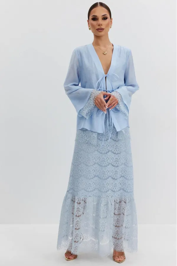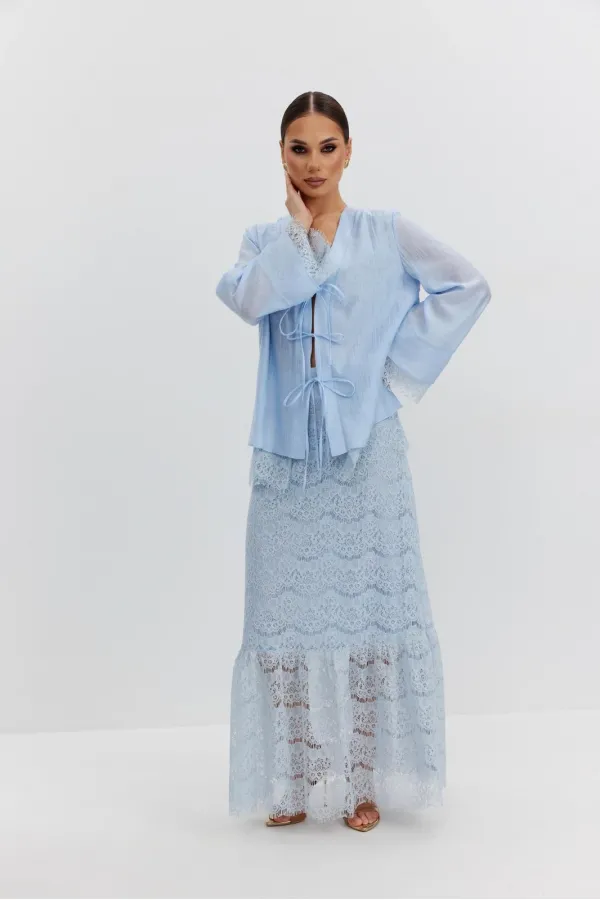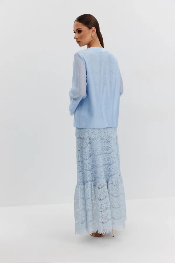 Юбка женская из кружевной ткани, имеет А-образный расширенный силуэт, с широким воланом со сборкой по низу, длина макси, юбка на подкладке. Верх юбки на поясе, со шлевками под ремень, застежка на потайную молнию по среднему шву сзади.