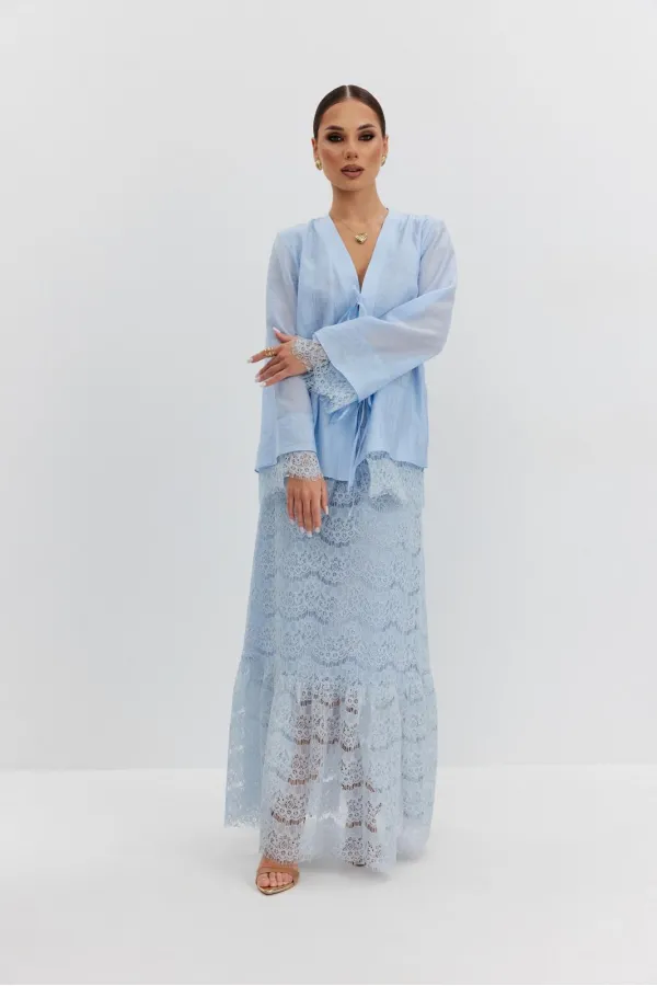 Юбка женская из кружевной ткани, имеет А-образный расширенный силуэт, с широким воланом со сборкой по низу, длина макси, юбка на подкладке. Верх юбки на поясе, со шлевками под ремень, застежка на потайную молнию по средн... Читать далее...