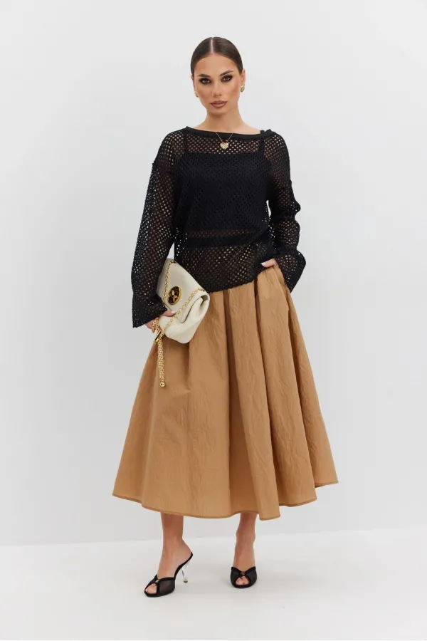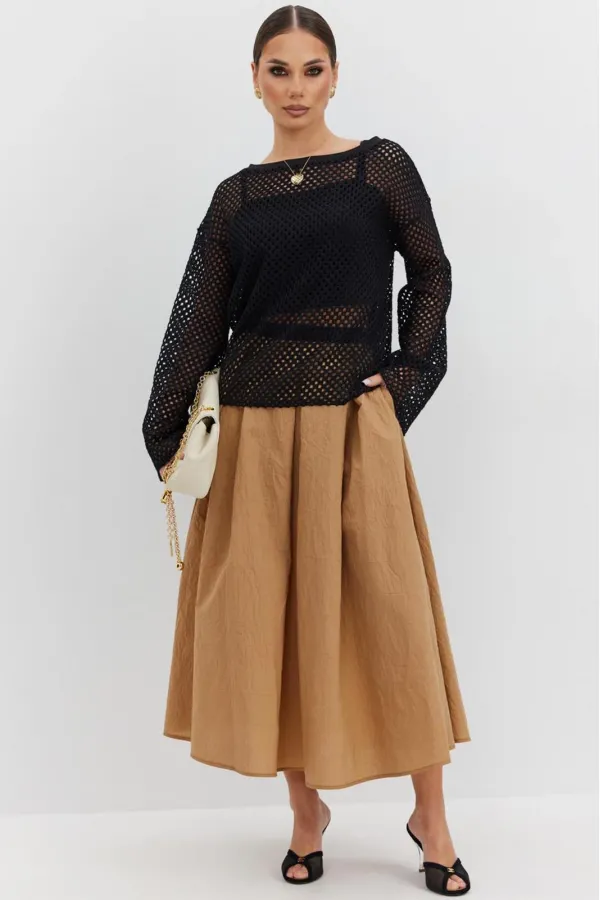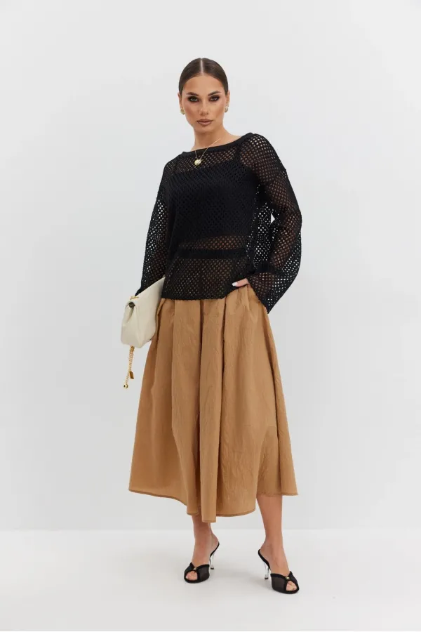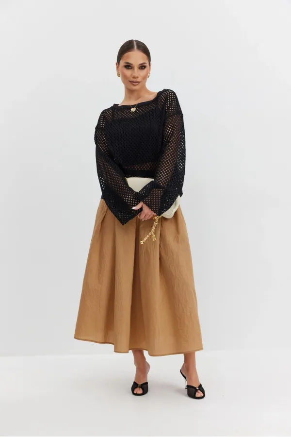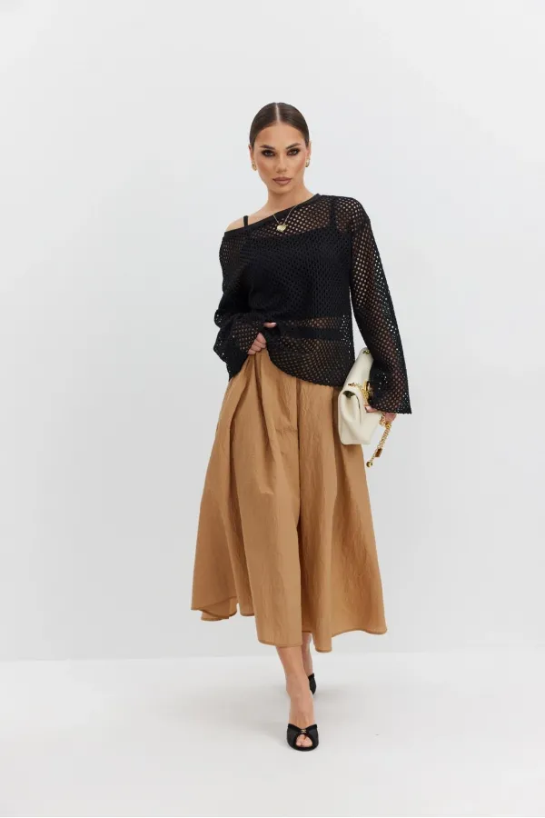 Юбка из плательно-блузочной ткани расширенная к низу длины «миди». Пояс отрезной, по переднему и заднему полотнищам заложены встречные складки. Застежка- молния в среднем шве заднего полотнища.