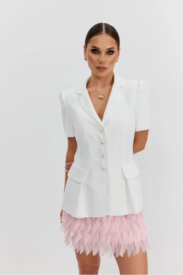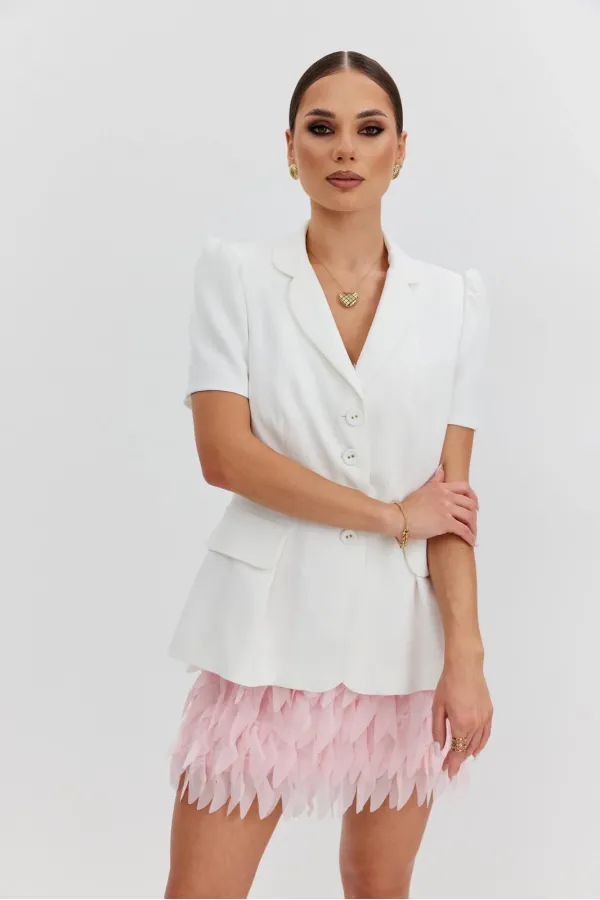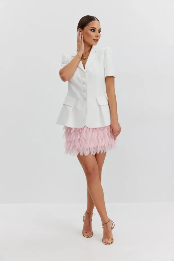 Юбка прямая из костюмно-плательной фактурной ткани, длины «мини». Пояс цельнокроеный, собран на резинку. Юбка на подкладке.