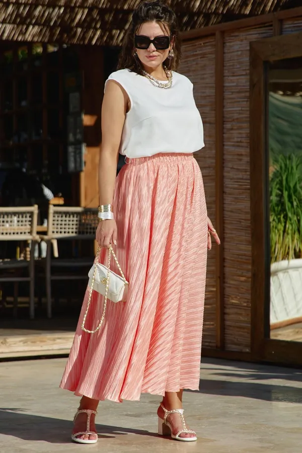 Юбка «полусолнце» в длине миди с жатой фактурой — это сочетание лёгкой драматичности и непринуждённой элегантности. Её силуэт создаёт мягкую визуальную волну, а жатая поверхность превращает каждый изгиб в игру света и тени: она одновременно утончённая и характерная, романтичная и по-городски современная. Из-за сжатой фактуры ткани юбка выглядит живой и объёмной.